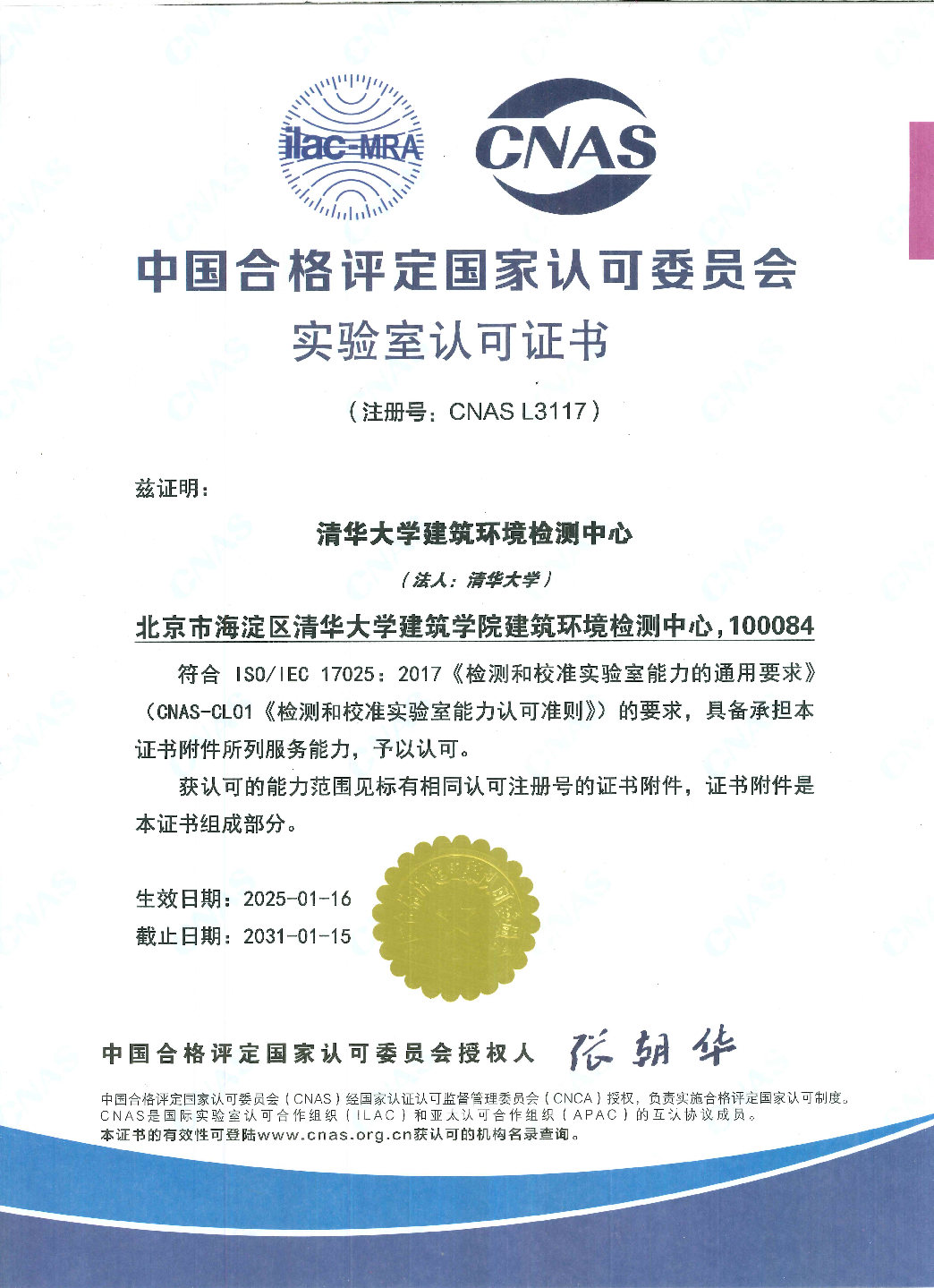 清华大学建筑环境检测中心是由清华大学授权,经国家技术监督局,于1993年正式成立的具有第三方公正地位的检测机构,有国家CMA认证证书及国际认可CNAS证书,可独立开展检测工作并出具具有法律效力的检测、评估报告。